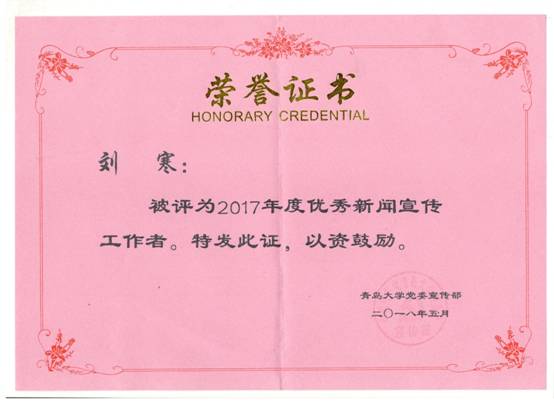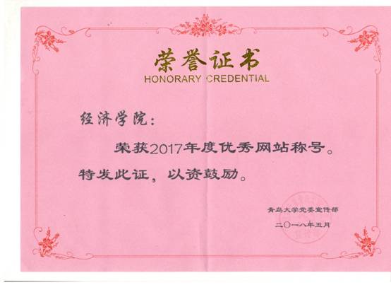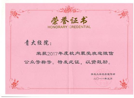 网站被评为学校2017年度优秀网站,“青大经院”微信公众号被评为2017年度校内最受欢迎微信公众号,刘寒同志被评为2017年度优秀新闻宣传工作者。